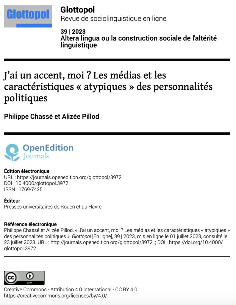 Chassé, P., and Pillod, A. (2023). J’ai un accent, moi ? Les médias et les caractéristiques « atypiques » des personnalités politiques. Glottopol, n°39, 185-212.