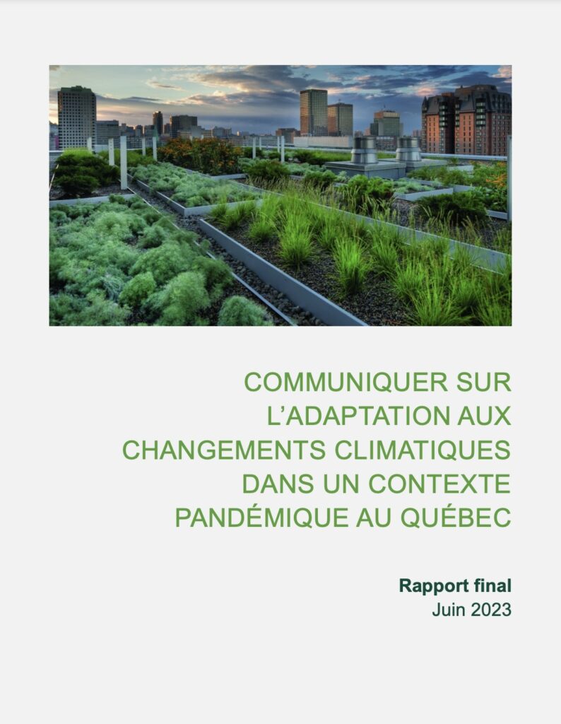Boivin, M., Champagne St-Arnaud, V., Briand, A.-S., Généreux, M., Lachapelle, E., Landaverde, E., Pillod, A. et Scheed, H. (2023). Communiquer sur l’adaptation aux changements climatiques dans un contexte pandémique au Québec. Rapport final présenté à Ouranos et au ministère de l’Environnement, de la Lutte contre les changements climatiques, de la Faune et des Parcs (MELCCFP). Montréal, Canada.