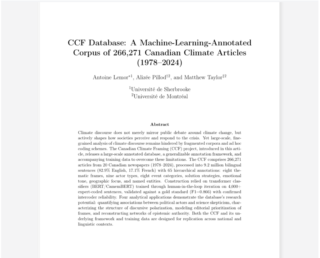 In collaboration with Antoine Lemor and Matthew Taylor, we are preparing the public release of the Canadian Climate Framing (CCF) database, a unique resource designed to help researchers analyze how media coverage of climate change has evolved across time, space, and language in Canada.